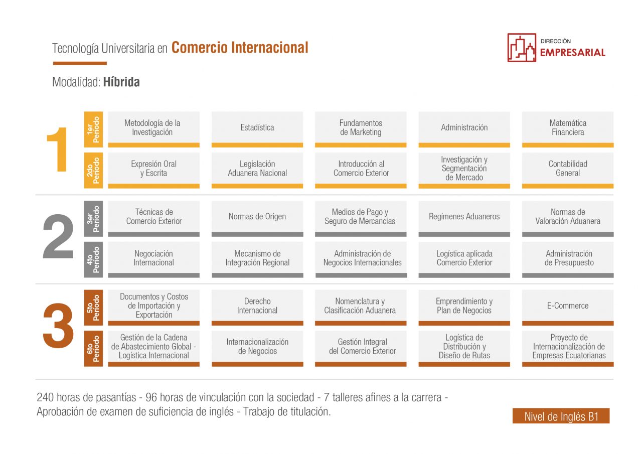 Bienvenidos a la carrera de Comercio Internacional donde tendrán la capacidad de trabajar en equipo; diseñar, implantar y controlar procesos, que permitan a la empresa operar como un negocio global. Sus actividades van a transcurrir de manera permanente y continua a través del ciclo de planear, organizar, dirigir, controlar y diseñar todas las actividades, dirigidas a ingresar y permanecer en mercados internacionales o para atraer inversión extranjera.